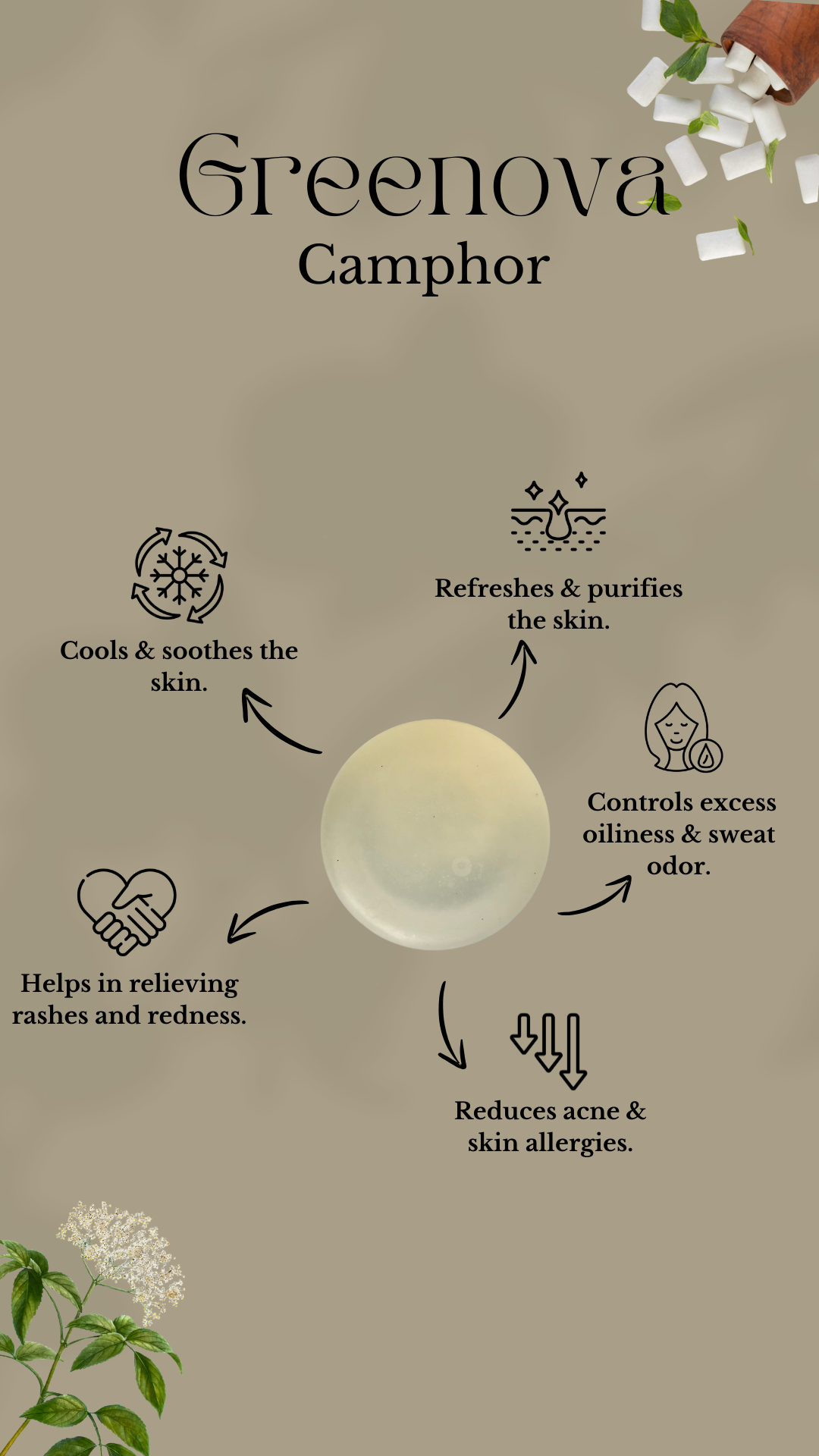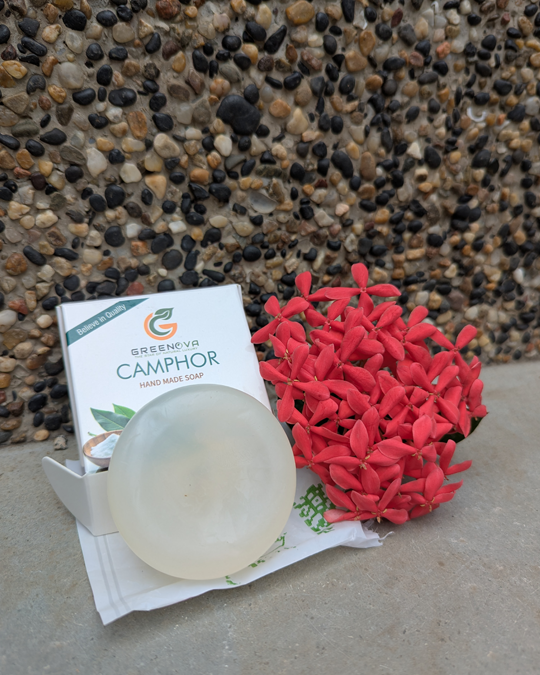 Camphor Soap is a refreshing, aromatic cleansing bar infused with natural camphor, known for its cooling, antibacterial and soothing properties. It helps calm itching, reduce acne, fight fungal infections and refresh the skin, leaving it clean.