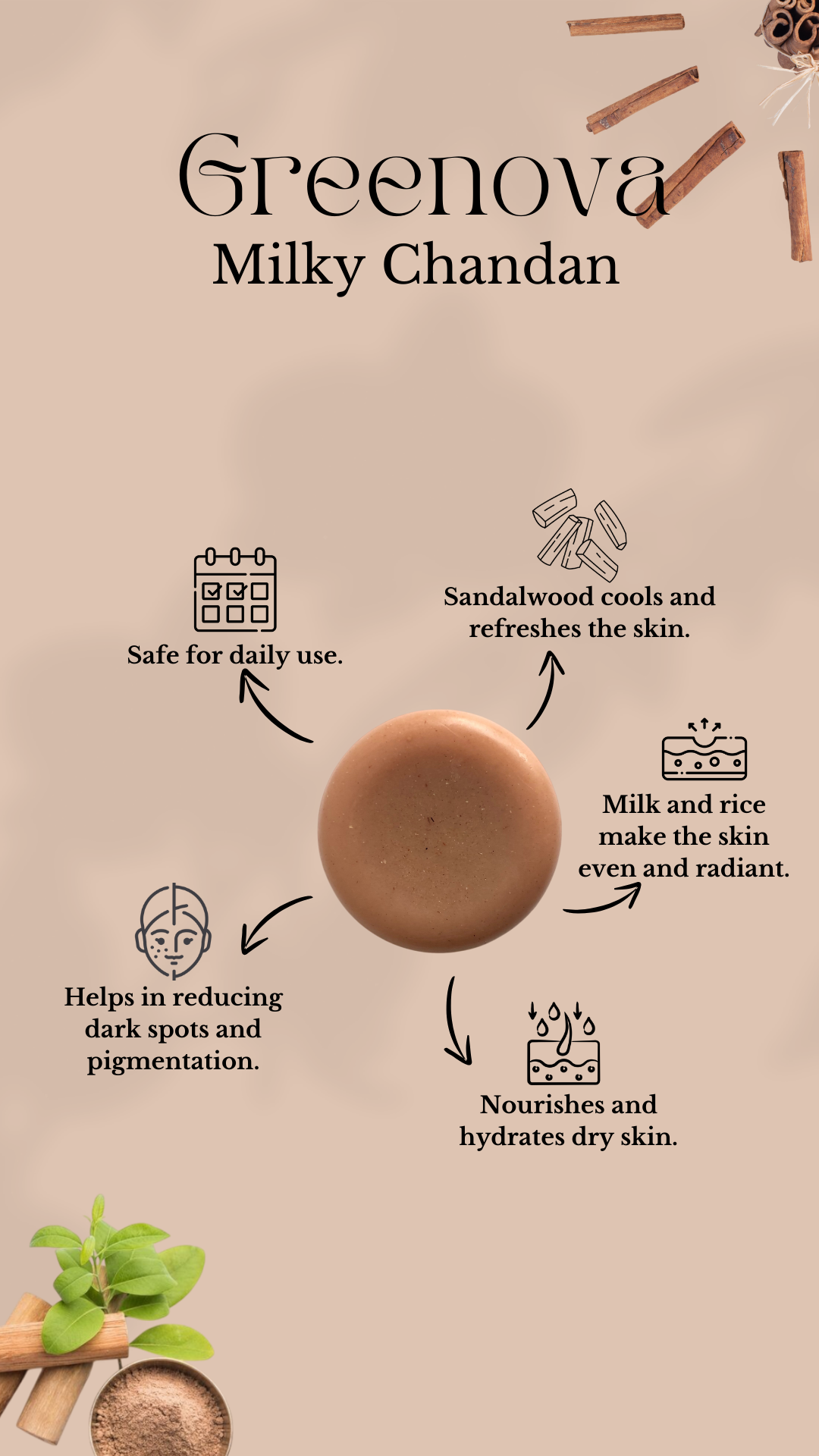 Milky Chandan Bar combines the nourishment of milk with the calming aroma of sandalwood, gently cleansing while moisturizing the skin. It leaves your skin soft, radiant and delicately fragrant.