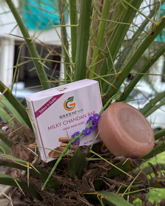 Milky Chandan Bar combines the nourishment of milk with the calming aroma of sandalwood, gently cleansing while moisturizing the skin. It leaves your skin soft, radiant and delicately fragrant.